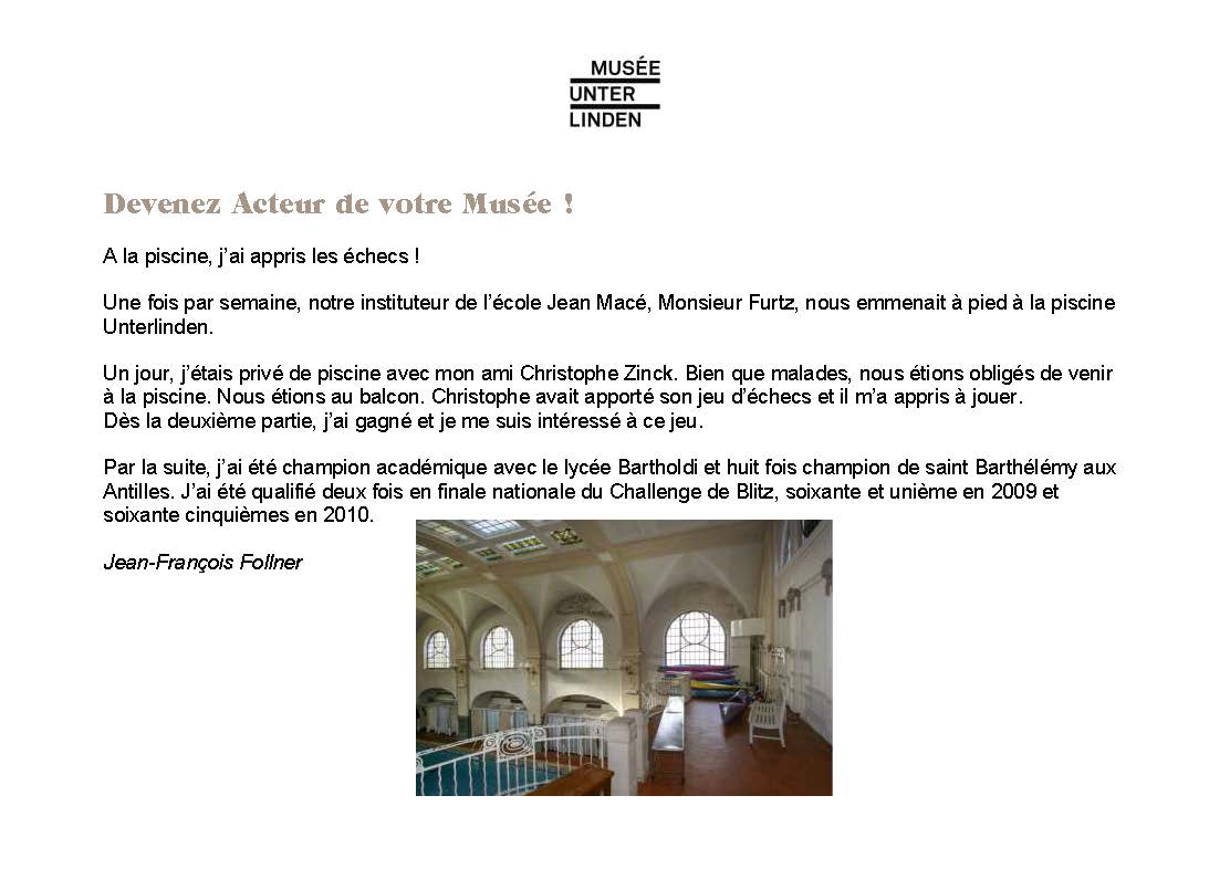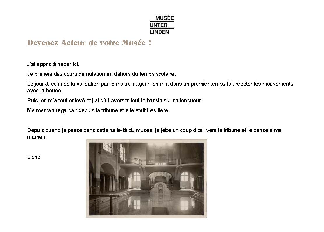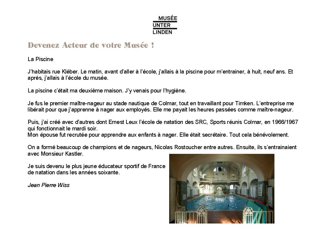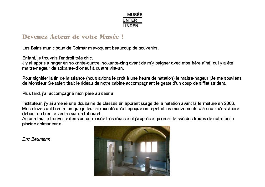 Vous avez fréquenté les bains municipaux de Colmar ? Nous collectons des histoires quotidiennes ou extraordinaires que vous avez vécues dans les anciens Bains municipaux. Nous attendons vos souvenirs, anecdotes, rencontres et aventures avec ce lieu que vous pouvez envoyer directement en cliquant ici