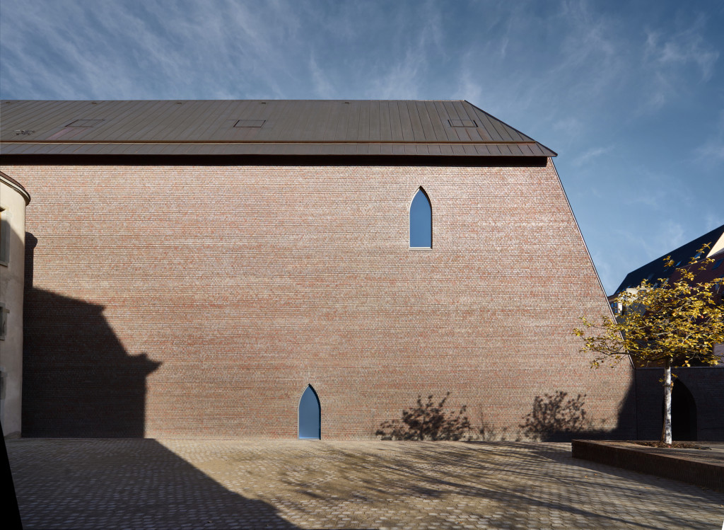 L’aile nouvelle reprend la volumétrie de la chapelle des Dominicaines et évoque une architecture archaïque sans l’imiter. Les façades de briques cassées permettent de créer d’une manière contemporaine une rugosité qui intègre le bâtiment dans son contexte historique au centre de Colmar. La toiture et le pignon incliné sont en cuivre. La petite maison sur la place est matérialisée de la même manière.